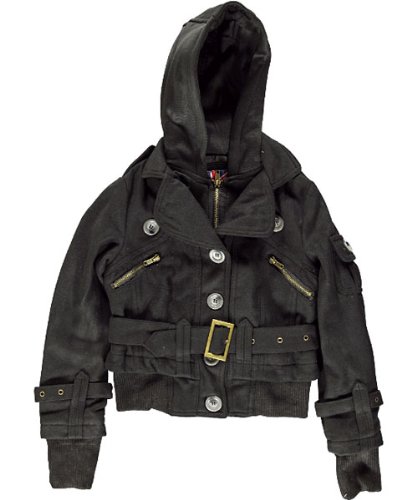 Top off her cutest outfits with the chic look of this Miss London coat! The hoodie trim zips up under the notched collar and button placket. Accents include extended ribbing at cuffs and hem, button shoulder flaps, a button pocket on the sleeve, and zip chest pockets. Buckle belts at the waist and cuffs create a cute tapered fit. The warm, wool blend felt is fully lined. Shell 70% Polyester, 30% Wool Lining 100% Polyester Dry Clean Only Made in China